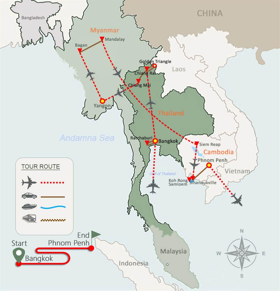 Bangkok (+Ratchaburi) → Chiang Rai → Chiang Mai → Yangon → Bagan → Mandalay → Siem Reap → Sihanoukville (Koh Rong Samloem) → Phnom Penh