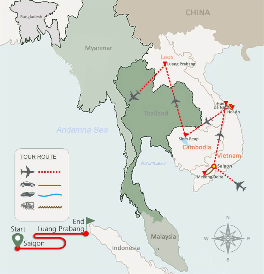 Saigon → Mekong Delta → Hue → Hoi An → Da Nang → Siem Reap → Luang Prabang